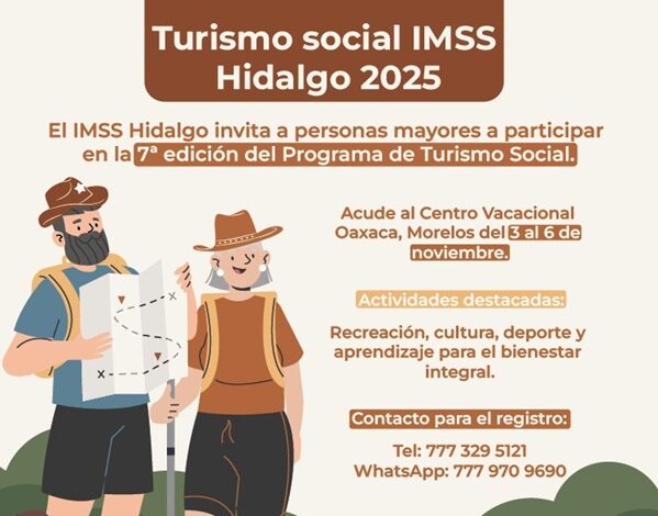 PACHUCA DE SOTO, 29 OCT /NEWS HIDALGO/.- El Instituto Mexicano del Seguro Social (IMSS) en Hidalgo, a través de la Oficina de Bienestar Social y Atención a Pensionados, invita a personas mayores a participar en la séptima edición del Programa de Turismo Social, que se llevará a cabo del 3 al 6 de noviembre de 2025 en el Centro Vacacional Oaxtepec, Morelos, bajo la temática “Diversión Vaquera”.