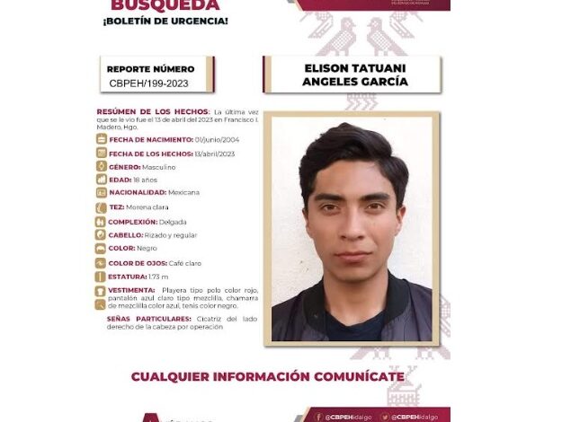 A través de redes sociales, la imagen y datos del masculino identificado como Elison Tatuiani Angeles García, de 18 años, fue difundida para poder ubicar su paradero luego de desaparecer desde el pasado 13 del presente mes en el municipio de Francisco I. Madero.