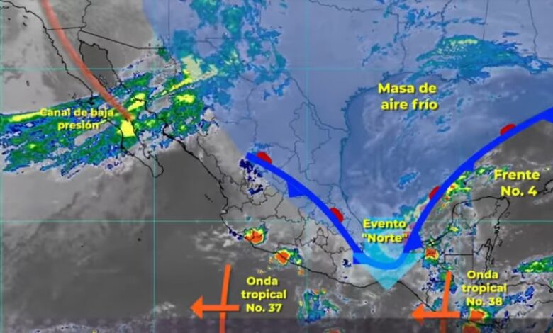 Por otra parte, un canal de baja presión sobre la Sierra Madre Occidental y el paso de la Onda Tropical Número 37 por el sur de Jalisco originarán lluvias fuertes (de 25 a 50 mm) en Colima, Estado de México, Guerrero, Jalisco, Michoacán, Puebla y Yucatán; chubascos (de 5 a 25 mm) en Ciudad de México, Durango, Hidalgo, Morelos, Nayarit, Quintana Roo, Tlaxcala y Zacatecas, y lluvias aisladas (de 0.1 a 5 mm) en Aguascalientes, Coahuila, Guanajuato, Nuevo León, San Luis Potosí, Sinaloa y Tamaulipas.