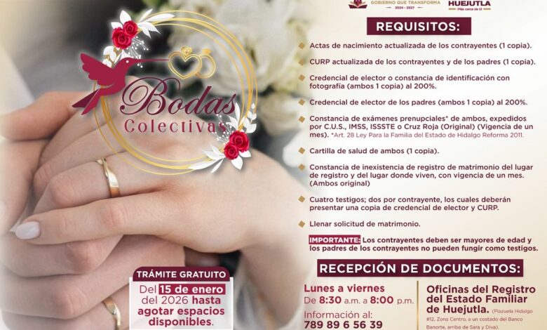 HUEJUTLA DE REYES, 15 ENE /NEWS HIDALGO/.-  El Sistema DIF Huejutla, presidido por la Dra. Kristel Rodríguez Flores y el Gobierno Municipal que encabeza el Lic. Alfredo San Román Duval, invitan a la población mayor de 18 años, que desee voluntariamente unirse en matrimonio, a participar en el registro de Bodas Colectivas 2026, que se celebrarán el próximo mes de febrero.