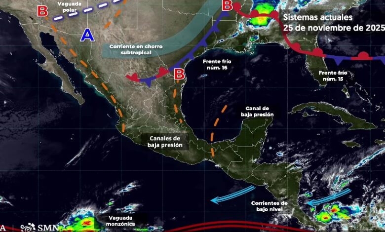 PACHUCA DE SOTO, 25 NOV/NEWS HIDALGO/.- Para hoy, el frente núm. 16 se extenderá sobre el norte y noreste de México, y en interacción con la corriente en chorro subtropical y con un canal de baja presión, ocasionará lluvias puntuales fuertes con descargas eléctricas en Nuevo León y Tamaulipas, así como chubascos en Coahuila y San Luis Potosí. Por otra parte, canales de baja presión sobre el occidente, oriente y sureste de la República Mexicana, en combinación con el ingreso de aire húmedo proveniente del océano Pacífico, golfo de México y mar Caribe, generarán chubascos dispersos con posibles descargas eléctricas en Oaxaca, Chiapas, Veracruz (regiones Papaloapan, Los Tuxtlas y Olmeca), Tabasco y Quintana Roo; y lluvias aisladas en Hidalgo (regiones Sierra Alta y Huasteca), Puebla (regiones Sierra Norte, Sierra Nororiental y Tehuacán-Sierra Negra), Veracruz (regiones Huasteca Alta, Huasteca Baja y Capital), así como en zonas de Jalisco, Michoacán, Guanajuato, Querétaro, Estado de México, Ciudad de México, Guerrero, Campeche y Yucatán. Finalmente, continuará el ambiente frio a muy frío durante la mañana y noche con heladas al amanecer en zonas altas de Mesa del Norte y la Mesa Central, llegando a ser gélido con heladas y temperaturas mínimas menores a –5 °C en zonas serranas de Chihuahua y Durango.
