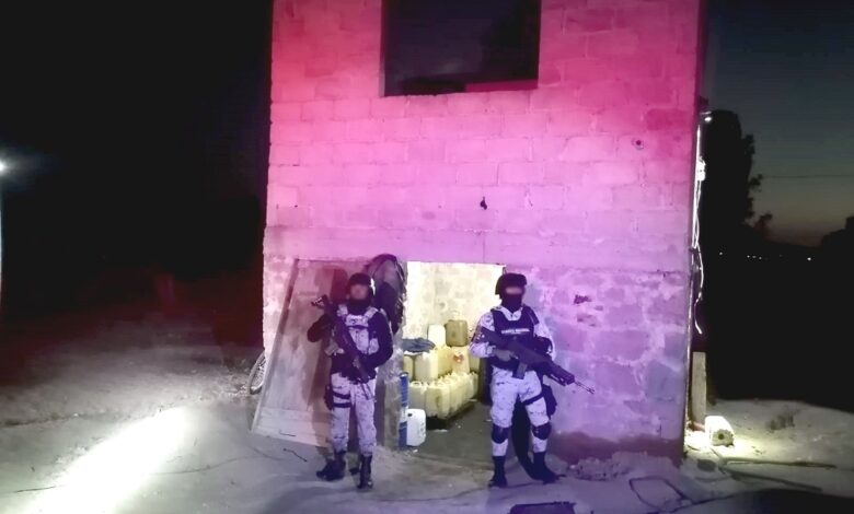 Al examinar el lugar, personal de la Guardia Nacional detectó que había más recipientes en el interior de la bodega con diferentes cantidades de combustible, por lo fue resguardado.