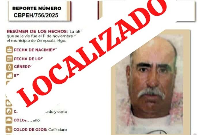 ZEMPOALA, 11 NOV /NEWS HIDALGO/.- Familiares de Claro Mendoza Islas reportan que el hombre de 66 años fue hallado con vida esta tarde en unas minas del municipio de Zempoala donde esta madrugada desapareció cuando salió de su casa para ir al sanitario.