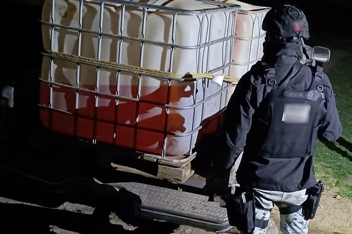 Al realizar patrullajes de prevención y vigilancia en el municipio de Pachuca, Hidalgo, personal de la GN ubicó una unidad cargada con dos contenedores, con capacidad de mil litros cada uno; uno al 90 por ciento de su capacidad y otro al 40 por ciento.