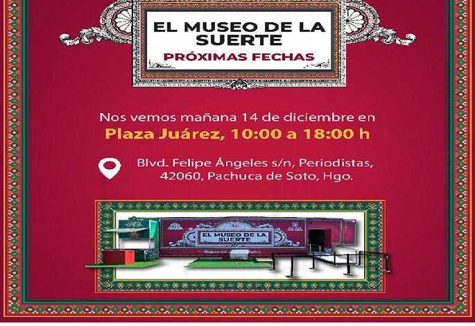 PACHUCA DE SOTO, 13 DIC/NEWS HIDALGO/.- Como parte de su gira, el Museo de la Suerte de Lotería Nacional hará escala este domingo 14 de diciembre en Pachuca, donde las y los visitantes podrán conocer de manera gratuita la historia y el legado de una de las instituciones con mayor tradición en el país.