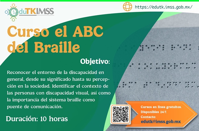 PACHUCA DE SOTO, 08 ENE /NEWS HIDALGO/.- El Instituto Mexicano del Seguro Social (IMSS) en Hidalgo informa que, a través de la plataforma edu TK IMSS, se encuentra disponible el curso en línea “El ABC del Braille”, una capacitación orientada a fortalecer la inclusión, la accesibilidad y la sensibilización social en torno a la discapacidad visual.