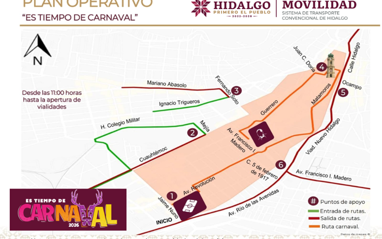 PACHUCA DE SOTO, 06 FEB /NEWS HIDALGO/.- La Secretaría de Movilidad y Transporte informa que, el Sistema de Transporte Convencional de Hidalgo (STCH), organismo sectorizado a esta dependencia, implementará un operativo especial el día sábado 7 de febrero, derivado del cierre temporal de vialidades en la capital hidalguense, con motivo del evento “Es tiempo de carnaval”.