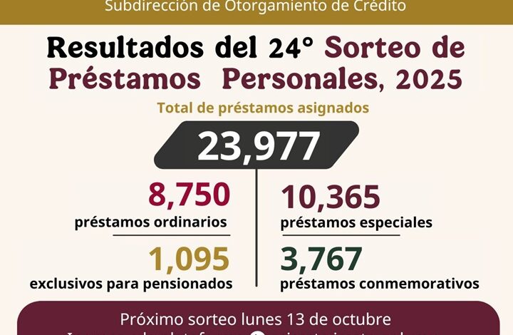 PACHUCA DE SOTO, 04 OCT /NEWS HIDALGO/.- El Instituto de Seguridad y Servicios Sociales de los Trabajadores del Estado (ISSSTE), encabezado por el director general Martí Batres Guadarrama, informa que en el vigésimo cuarto sorteo convencional del Programa Anual de Préstamos Personales 2025 se asignaron 23 mil 977 créditos, salieron todos aquellos que cumplieron los requisitos.