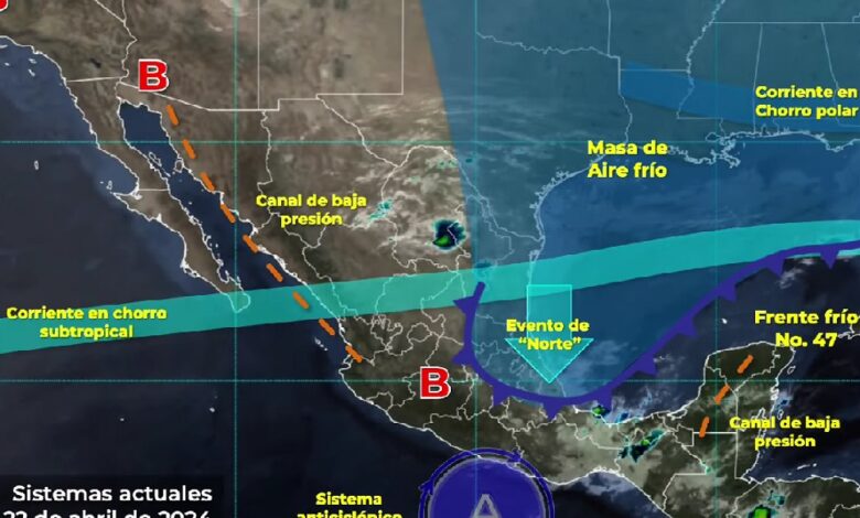 PACHUCA DE SOTO, 22 ABR/NEWS HIDALGO/.- Para este día, se pronostica que el frente frío número 47, que recorrerá el oriente y sureste de México hasta la Península de Yucatán, en interacción con un canal de baja presión sobre dicha península, origine lluvias puntuales intensas (de 75 a 150 milímetros [mm]) en zonas de Oaxaca, Puebla y Veracruz; muy fuertes (de 50 a 75 mm) en Chiapas e Hidalgo; fuertes (de 25 a 50 mm) en Ciudad de México, Estado de México, Nuevo León, Querétaro, San Luis Potosí, Tabasco, Tamaulipas y Tlaxcala.