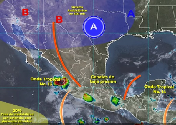 El monzón mexicano establecido en el noroeste de la República Mexicana, canales de baja presión extendidos por diferentes regiones del país, el ingreso de humedad del Océano Pacífico y Golfo de México, y la onda tropical número 14, la cual se aproximará a la Península de Yucatán, son los sistemas meteorológicos que propiciarán las condiciones descritas. La onda tropical número 13 se localizará al sur de la Península de Baja California y dejará de afectar al territorio nacional.
