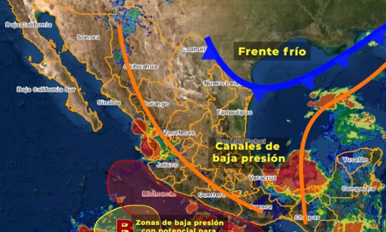Las condiciones atmosféricas serán generadas por un canal de baja presión extendido sobre el Golfo de México hasta el sureste del país, en interacción con la vaguada monzónica, que se extenderá muy próxima a las costas del Pacífico Sur Mexicano, una zona de baja presión frente a la costa de Guerrero con probabilidad para desarrollo ciclónico y por la entrada de humedad del Mar Caribe, así como un canal de baja presión que se extenderá a lo largo de la Sierra Madre Occidental hasta el centro del territorio mexicano, en combinación con el ingreso de humedad del Océano Pacífico e inestabilidad en niveles altos de la atmósfera y por un frente frío que continuará muy cerca del noreste del país.