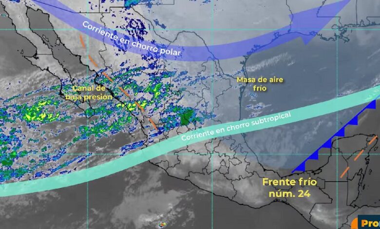 El frente frío número 24 que se extenderá sobre el sur del Golfo de México y el oriente de la República Mexicana, y un canal de baja presión extendido sobre la Península de Yucatán, ocasionarán lluvias puntuales fuertes (de 25 a 50 milímetros [mm]) en regiones de Puebla y Veracruz; intervalos de chubascos (de 5 a 25 mm) en Chiapas, Hidalgo, Oaxaca, Querétaro, San Luis Potosí y Yucatán, así como lluvias aisladas (de 0.1 a 5 mm) en Baja California, Campeche, Guerrero, Quintana Roo, Tabasco y Tamaulipas. Para el occidente y norte del país, además del Valle de México se pronostica cielo parcialmente nublado y baja probabilidad de lluvias. Temperaturas máximas de 35 a 40 grados Celsius se pronostican para Campeche, Chiapas, Colima, Guerrero, Jalisco, Michoacán, Oaxaca, Quintana Roo y Yucatán, y de 30 a 35 grados Celsius en Tabasco y sur de Veracruz.