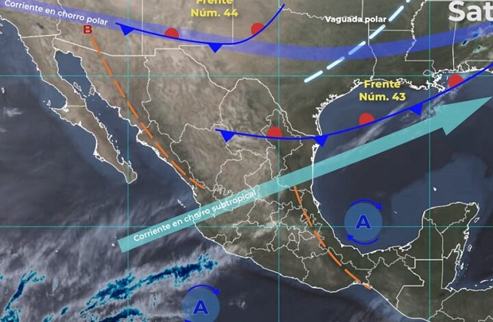 Las condiciones meteorológicas serán originadas por el sistema frontal número 43, que se ubicará con características de estacionario sobre el norte y noreste de México; un canal de baja presión que se extenderá sobre el territorio nacional, en interacción con el ingreso de humedad del Océano Pacífico y Golfo de México; inestabilidad en la atmósfera superior; el sistema frontal número 44 que se extenderá sobre la frontera noroeste del país, en combinación con la corriente en chorro polar.