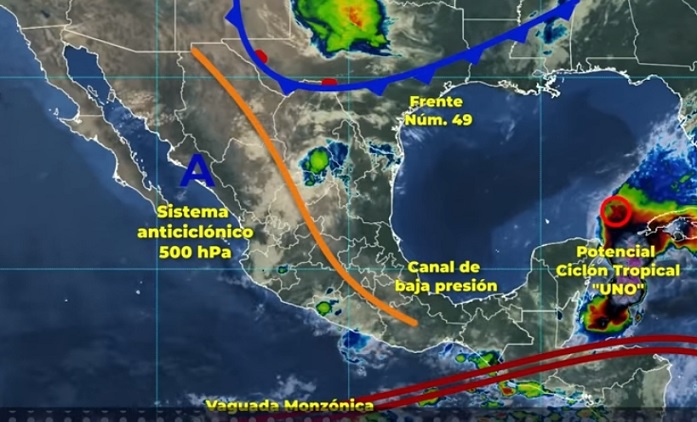Las lluvias se acompañarán de descargas eléctricas, vientos fuertes y probable caída de granizo, y son generadas por el Potencial Ciclón Tropical Uno, ubicado frente a la costa noreste de Quintana Roo, la vaguada monzónica cercana a las costas de Chiapas y canales de baja presión extendidos sobre la Sierra Madre Occidental y el centro de México.