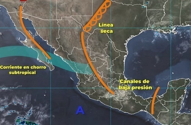 Las precipitaciones serán generadas por una línea seca extendida sobre el noreste de México en interacción con un canal de baja presión y con la entrada de humedad del Golfo de México, así como un canal de baja presión ubicado sobre el centro, oriente y sureste de México.