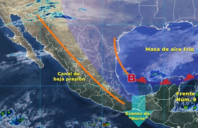 Las condiciones meteorológicas antes mencionadas serán originadas por el Frente Número 9, con características de estacionario sobre el sur del Golfo de México, en interacción con un canal de baja presión ubicado en el occidente de dicho golfo, su masa de aire frío, el ingreso del Frente Frío Número 10 a la frontera norte de México, previsto durante esta tarde, en combinación con la corriente en chorro subtropical y polar, así como por el ingreso de humedad del Océano Pacífico y Golfo de México.