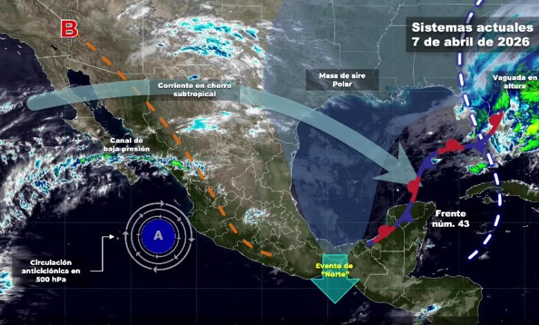 PACHUCA DE SOTO, 07 ABR/NEWS HIDALGO/.- Este día, el frente núm. 43 se extenderá con características de estacionario sobre la península de Yucatán, en interacción con un canal de baja presión sobre el sureste del país, generarán chubascos y lluvias puntuales fuertes en dichas regiones, así como muy fuertes en Chiapas. Mientras tanto, la masa de aire polar asociada al frente mantendrá bancos de niebla en zonas del oriente y sureste de México, así como evento de “Norte” durante la mañana, en Veracruz, Tabasco, Campeche, istmo y golfo de Tehuantepec. Por otra parte, un canal de baja presión al interior del territorio nacional, en combinación con el ingreso de humedad del océano Pacífico y golfo de México, originará lluvias y chubascos con descargas eléctricas en estados del norte, noreste, oriente, centro, occidente y sur de la República Mexicana. Finalmente, una circulación anticiclónica en niveles medios de la atmósfera en el occidente del territorio mexicano, mantendrá la onda de calor en zonas de Sinaloa (sur), Nayarit (norte), Jalisco (centro, sur y suroeste), Michoacán (centro y oeste), Guerrero (noroeste, centro y sur), Oaxaca (centro y sur) y Morelos (sur), iniciando a partir de este día en Chiapas (costa).