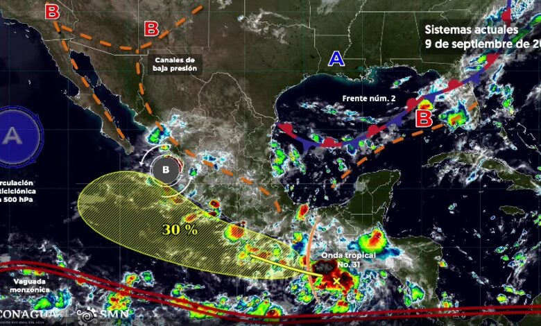 PACHUCA DE SOTO, 09 SEP/NEWS HIDALGO/.- Este día, el monzón mexicano, en combinación con una circulación ciclónica en niveles medios de la atmósfera sobre el occidente del país y con inestabilidad atmosférica, generarán lluvias muy fuertes en Sinaloa, Nayarit, Jalisco, Colima y Michoacán; lluvias fuertes en Durango; chubascos en Baja California Sur, Sonora y Chihuahua, así como lluvias aisladas en Baja California. Por otra parte, el frente núm. 2 prevalecerá con características de estacionario sobre el noreste de México, en interacción con una vaguada en niveles medios de la atmósfera, propiciarán lluvias muy fuertes en Tamaulipas y San Luis Potosí; lluvias fuertes en Nuevo León e intervalos de chubascos en Coahuila; así como rachas de viento de 30 a 50 km/h en los estados mencionados. Simultáneamente, la onda tropical núm. 31 se desplazará sobre el sureste mexicano, asociada con una zona de baja presión con probabilidad para desarrollo ciclónico al sur del golfo de Tehuantepec y, en interacción con el ingreso de humedad del golfo de México y mar Caribe, originarán lluvias puntuales intensas en Oaxaca y Chiapas; muy fuertes en Veracruz, Tabasco, Campeche y Yucatán; así como lluvias fuertes en Quintana Roo. Asimismo, el ingreso de humedad del océano Pacífico y golfo de México e inestabilidad atmosférica, ocasionarán lluvias fuertes a muy fuertes en el norte, oriente, centro y sur del territorio nacional. Finalmente, continuará el ambiente caluroso a muy caluroso en estados del norte de la República Mexicana, entidades del litoral del Pacífico y del golfo de México, además de la península de Yucatán; con temperaturas que podrían superar los 40 °C en zonas de Baja California y Sonora.