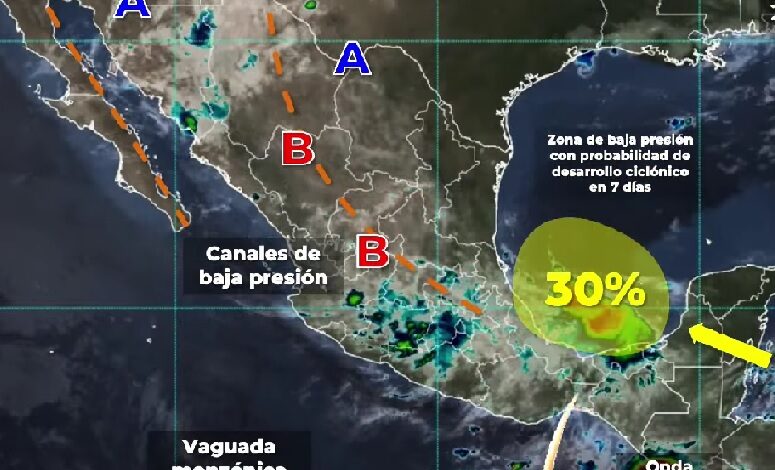 PACHUCA DE SOTO, 29 JUN/NEWS HIDALGO/.- Debido a la zona de baja presión con potencial ciclónico que se encuentra sobre la Sonda de Campeche, se pronostican lluvias torrenciales (de 150 a 250 milímetros [mm]) en Campeche, Chiapas, Quintana Roo y Yucatán; intensas (de 75 a 150 mm) en Oaxaca, Tabasco y Veracruz; viento con rachas de 60 a 80 kilómetros por hora (km/h), oleaje de 2 a 4 metros (m) de altura y condiciones para la formación de trombas en costas de la Península de Yucatán.