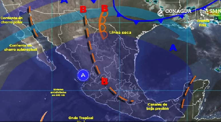 El desplazamiento de la Onda Tropical Número 2 por el sur de Guerrero, canales de baja presión sobre el norte y centro del país, inestabilidad en niveles altos de la atmósfera y la humedad proveniente de ambos océanos, podrían ocasionar lluvias fuertes (de 25 a 50 milímetros [mm]) en Campeche, Chiapas, Oaxaca, Quintana Roo y Yucatán; chubascos (de 5 a 25 mm) en Coahuila, Durango, Guerrero, Jalisco, Michoacán y Zacatecas, y lluvias aisladas (de 0.1 a 5 mm) en Aguascalientes, Baja California, Ciudad de México, Estado de México, Guanajuato, Hidalgo, Morelos, Nayarit, Nuevo León, Puebla, San Luis Potosí, Tabasco, Tamaulipas, Tlaxcala y Veracruz.