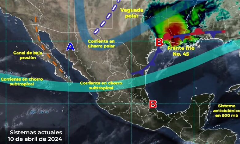 PACHUCA DE SOTO, 10 ABR/NEWS HIDALGO/.- Para las próximas horas, se prevé que el frente frío número 45, que recorrerá la vertiente del Golfo de México y el sureste de México en interacción con un canal de baja presión sobre la Península de Yucatán, ocasione lluvias puntuales intensas (75 a 150 milímetros [mm]) en Campeche, Chiapas y Tabasco; muy fuertes (50 a 75 mm) en Yucatán, y chubascos (de 5 a 25 mm) en Oaxaca, Puebla, Quintana Roo y Veracruz. Adicionalmente, se pronostican lluvias aisladas (de 0.1 a 5 mm) en Hidalgo.