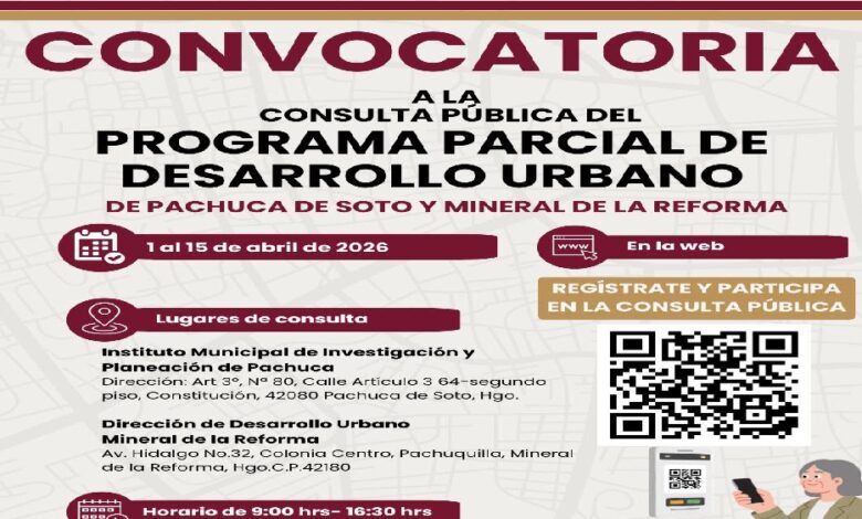 Para facilitar la participación, se habilitaron puntos de consulta presencial en el Instituto Municipal de Investigación y Planeación de Pachuca, así como en la Dirección de Desarrollo Urbano de Mineral de la Reforma, donde el documento puede revisarse en un horario de 9:00 a 16:30 horas.