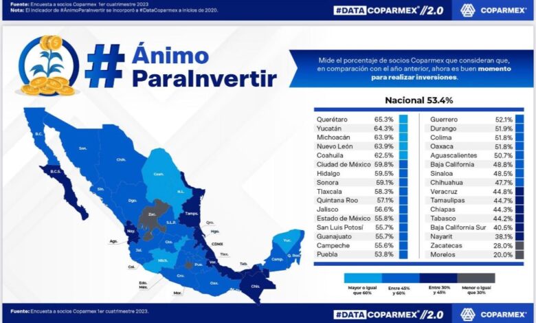 PACHUCA DE SOTO, 07 JUL /NEWS HIDALGO/.- Pese al incremento en el número de socios de la Confederación Patronal de la República Mexicana (Coparmex) que han sido víctimas de algún delito en el último año, el indicador “Ánimo Para Invertir” de la plataforma “DataCoparmex”, pasó de 52 a 53.4 por ciento en el primer cuatrimestre de 2023