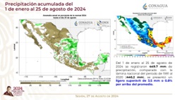 Estos resultados fueron generados, principalmente, por los 449.7 milímetros (mm) de lluvia acumulados del 1 de enero al 25 de agosto de 2024, los cuales representan un ligero superávit de 3.5 mm, es decir, 0.8 % más que la precipitación promedio histórica.