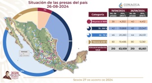 PACHUCA DE SOTO, 27 AGO/NEWS HIDALGO/.- Informe del Comité Técnico de Operación de Obras Hidráulicas Como resultado de las precipitaciones registradas durante la Temporada de Lluvias y Ciclones Tropicales 2024, se mantiene el incremento en el nivel de llenado de las 210 principales presas de México, que en conjunto tienen la capacidad de almacenar 92 % del agua de los embalses del país.