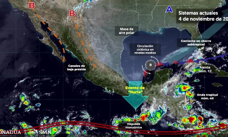 PACHUCA DE SOTO, 04 NOV/NEWS HIDALGO/.- Para hoy, el frente núm. 12 se extenderá con características de estacionario sobre la península de Yucatán y la Sonda de Campeche, interaccionará con la nuevaonda tropical(núm. 40) que se aproximará a Quintana Roo y con una circulación ciclónica en niveles medios de la atmósfera sobre el golfo de México, ocasionando lluvias fuertes a muy fuertes con descargas eléctricas en Veracruz (regiones Los Tuxtlas y Olmeca), Oaxaca (este), Chiapas (norte), Tabasco (oeste y centro), Campeche (suroeste), Yucatán (norte y este) y Quintana Roo (norte y costa). La masa de aire frío asociada al frente núm. 12 mantendrá el ambiente frío en el norte, noreste, oriente y centro del país, con bancos de niebla y heladas al amanecer en estados de la Mesa del Norte y la Mesa Central; a su vez, prevalecerá el evento de “Norte” muy fuerte con rachas de 70 a 80 km/h en el istmo y golfo de Tehuantepec (Oaxaca y Chiapas); así como viento de componente norte con rachas de 40 a 55 km/h en costas de Veracruz (sur), Tabasco, Campeche, Yucatán y Quintana Roo, disminuyendo por la tarde. Por otra parte, un canal de baja presión y el ingreso de humedad del océano Pacífico y golfo de México, ocasionarán lluvias y chubascos dispersos en estados del occidente y sur del territorio nacional. Finalmente, se mantendrá baja probabilidad de lluvia en el noroeste, norte, noreste y centro de México.