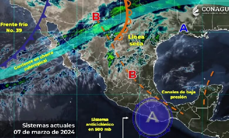 PACHUCA DE SOTO, 07 MAR/NEWS HIDALGO/.- Para este jueves, se mantendrá la baja probabilidad de lluvia y el ambiente de caluroso a muy caluroso en la mayor parte de México, incluida la Península de Yucatán y el Valle de México, con temperaturas máximas de 40 a 45 grados Celsius en Campeche, Guerrero, Michoacán, el sur de Morelos, Oaxaca, San Luis Potosí, Tamaulipas y Yucatán, y de 35 a 40 grados en Chiapas, Colima, el suroeste del Estado de México, Guanajuato, Hidalgo, Jalisco, Nayarit, Nuevo León, el suroeste de Puebla, Querétaro, Quintana Roo, Tabasco y Veracruz.