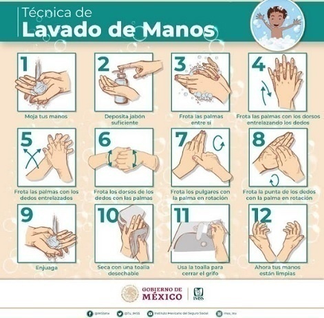 La coordinadora auxiliar de Salud Pública del IMSS en Hidalgo, doctora Llurely Cristina Islas Téllez, detalló que la técnica cosiste en mojar las manos, frotar el jabón hasta conseguir abundante espuma, a continuación friccionar las palmas, enjabonar el dorso de estas, así como entre los dedos; asimismo, seguir con los nudillos y el espacio que existe entre el dedo pulgar y el índice, finalmente, refregar las uñas sobre las palmas y enjuagar.