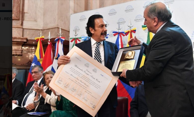 BUENOS AIRES, 15 AGO/NEWS HIDALGO/.- En el Salón Azul de la Cámara de Senadores de Argentina el gobernador Omar Fayad recibió la distinción “Líderes para el desarrollo: Gobernador Enrique Tomás Cresto”, por su política educativa, en particular por la implementación del Sistema Integral de Educación Media Superior (SIDEMS), modelo pedagógico único en México.
