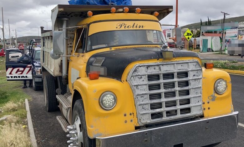 El aseguramiento de la unidad marca Dina, tipo volteo, color amarillo, con placas de Hidalgo, se llevó a cabo en la carretera Pachuca-Tulancingo, en la comunidad de Amaque, por agentes adscritos a la Unidad Especializada de Policía Canina de la Agencia de Seguridad Estatal.