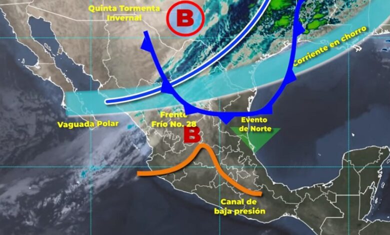 Por su parte, el Frente Frío Número 28 se desplazará sobre el noreste y el oriente de México, originando lluvias puntuales fuertes (de 25 a 50 milímetros [mm]) en Oaxaca, Puebla y Veracruz, mientras que la masa de aire polar que lo impulsa, provocará evento de norte de muy fuerte a intenso con rachas de viento de 70 a 90 kilómetros por hora (km/h) y oleaje de 2 a 4 metros de altura en el litoral de Tabasco, Tamaulipas y Veracruz; así como probabilidad para la caída de aguanieve o nieve en cimas montañosas con altitudes superiores a 4 mil metros sobre el nivel del mar de Puebla, Tlaxcala y Veracruz.