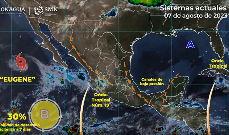 PACHUCA DE SOTO, 07 AGO/NEWS HIDALGO/.- Esta mañana, se espera que la onda tropical número 19 se localice al suroeste de Jalisco, dejando de afectar gradualmente al país, mientras que la presencia del monzón mexicano, así como canales de baja presión en el centro, sur y sureste del territorio nacional y una onda tropical sobre la Península de Yucatán, ocasionarán lluvias fuertes (de 25 a 50 milímetros [mm]) en Chiapas, Chihuahua, Guerrero Michoacán y Sonora.
