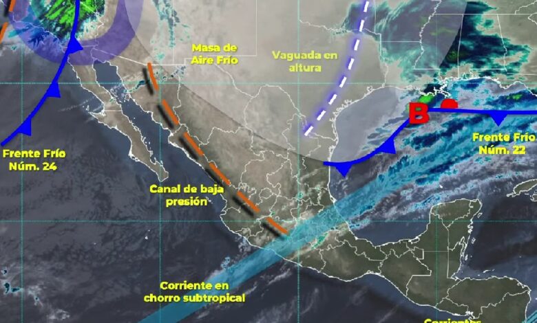 Por otra parte, el frente frío número 22 se desplazará sobre el Golfo de México y mantendrá su interacción con la corriente en chorro subtropical; ambos sistemas originarán lluvias puntuales fuertes (de 25 a 50 milímetros [mm]) en regiones de Chiapas, Oaxaca, Puebla y Veracruz; también, se prevén intervalos de chubascos (de 5 a 25 mm) en Baja California, Hidalgo, Querétaro, San Luis Potosí, Sonora y Tabasco, además de lluvias aisladas (de 0.1 a 5 mm) en Campeche, Chihuahua, Guanajuato, Nuevo León y Tamaulipas. Se mantendrá la baja probabilidad de lluvias en la Mesa del Norte, la Mesa Central, el occidente y el sur del territorio nacional.