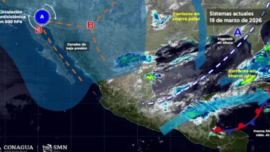 Para la Península de Baja California se pronostica cielo despejado la mayor parte del día, bancos de niebla matutinos en la costa occidental de Baja California, ambiente caluroso y viento de componente norte de 10 a 25 km/h.
