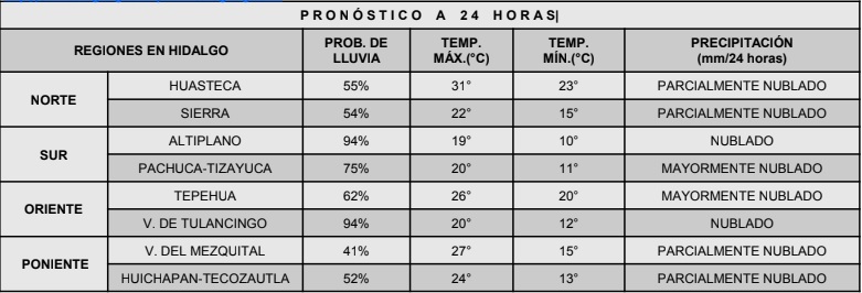 PACHUCA DE SOTO, 28 JUL/NEWS HIDALGO/.- Para hoy viernes, se pronostican lluvias puntuales muy fuertes (de 50 a 75 milímetros [mm]) en Chiapas, Jalisco y Nayarit; fuertes (de 25 a 50 mm) para regiones de Colima, Durango, Estado de México, Michoacán, San Luis Potosí, Sinaloa, Sonora, Tabasco, Tamaulipas, Veracruz, Yucatán y Zacatecas; intervalos de chubascos (de 5 a 25 mm) en sitios de Aguascalientes, Campeche, Chihuahua, Ciudad de México, Guanajuato, Guerrero, Hidalgo Morelos, Nuevo León, Oaxaca, Puebla, Querétaro, Quintana Roo y Tlaxcala, así como lluvias aisladas (de 0.1 a 5 mm) en Baja California, Baja California Sur y Coahuila.