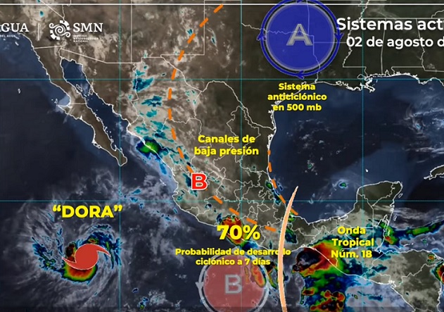 En el Océano Pacífico, Dora, ahora como huracán de categoría 1 en la escala SaffirSimpson, se localizó a las 03:00 horas, tiempo del centro de México, a 840 kilómetros al sur-suroeste de Cabo San Lucas, Baja California Sur. Tiene vientos máximos sostenidos de 150 km/h, rachas de 185 km/h y desplazamiento hacia el oeste a 26 km/h. Continuará alejándose del territorio nacional sin causar efectos en nuestro país.