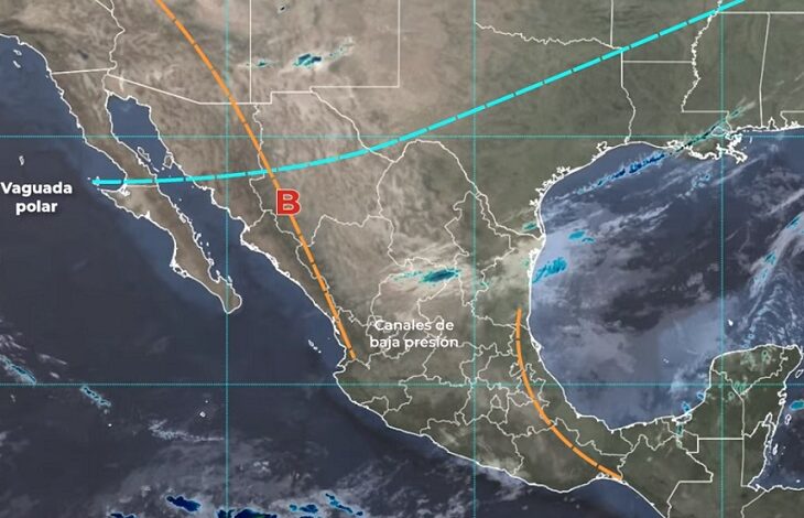 Las condiciones meteorológicas antes mencionadas serán originadas por una vaguada polar que se extenderá desde la Península de Baja California hasta el noreste de la República Mexicana, en interacción con la corriente en chorro subtropical; la entrada de humedad del Golfo de México y el Mar Caribe, en combinación con un canal de baja presión en el sureste del territorio mexicano, además de la aproximación de un nuevo frente frío a la frontera norte del país, durante esta noche.