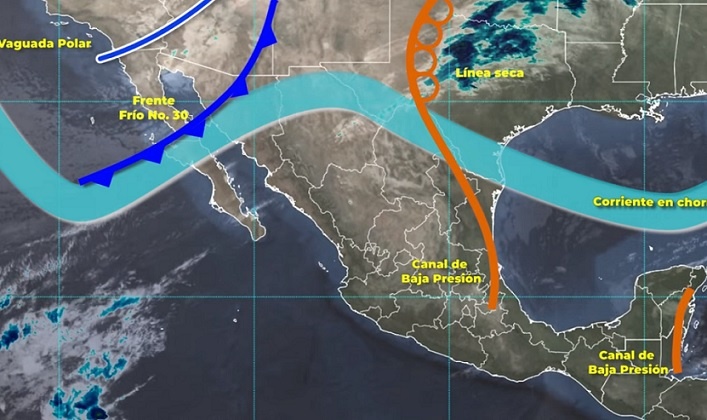 Las condiciones descritas serán generadas por el Frente Frío Número 30, que recorrerá el noroeste de México y se extenderá desde el norte de Chihuahua hasta el sur de Baja California Sur y se asociará con una vaguada polar, con la corriente en chorro subtropical y una línea seca; un sistema de alta presión en el Golfo de México y la entrada de humedad de ambos océanos