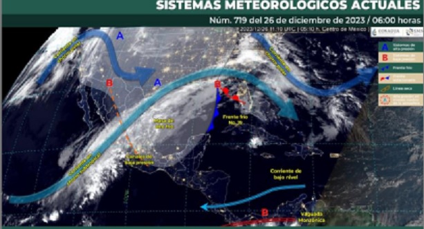 PACHUCA DE SOTO, 26 DIC/NEWS HIDALGO/.- Para este martes, se espera que el frente frío número 19 el cual se extenderá sobre el norte de la Península de Yucatán, y su masa de aire frío asociada que cubrirá el norte, noreste, centro y oriente del territorio nacional, ambos sistemas, en interacción con el abundante ingreso de humedad generado por la corriente en chorro subtropical, canales de baja presión e inestabilidad en niveles altos de la atmósfera, ocasionarán lluvias muy fuertes (de 50 a 75 milímetros [mm]) en Campeche, Chiapas, Puebla, Quintana Roo, Tabasco, Veracruz y Yucatán.