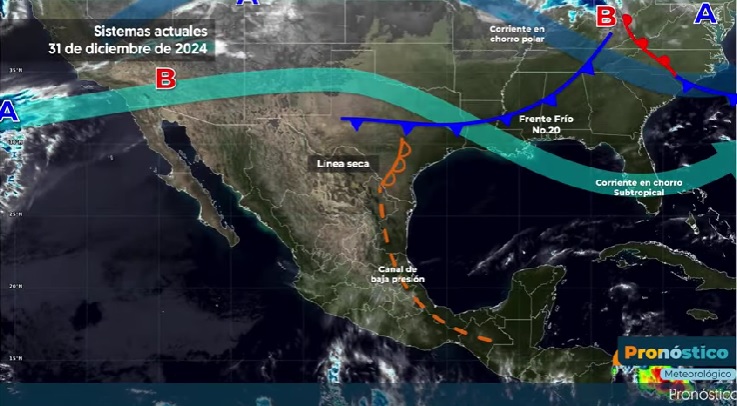 PACHUCA DE SOTO, 31 DIC/NEWS HIDALGO/.- El frente frío número 20 en su desplazamiento por el norte y noreste de México, la corriente en chorro subtropical y un canal de baja presión sobre el oriente y sureste de la República Mexicana, generarán lluvias fuertes (de 25 a 50 milímetros [mm]) en Chiapas; chubascos (de 5 a 25 mm) en Oaxaca, Tabasco y Veracruz; rachas de viento de 40 a 50 kilómetros por hora (km/h) y posibles tolvaneras en Chihuahua, Durango, Coahuila, Nuevo León y Tamaulipas.