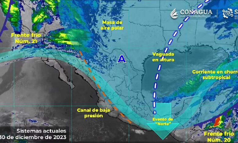 PACHUCA DE SOTO, 30 DIC/NEWS HIDALGO/.- Hoy, se prevé que, debido al ingreso de humedad del Océano Pacífico, en combinación con la corriente en chorro subtropical, se originen lluvias fuertes (de 25 a 50 milímetros [mm]) en Chiapas, Oaxaca, Tabasco y Veracruz; intervalos de chubascos (de 5 a 25 mm) en Campeche, Puebla y Quintana Roo, así como lluvias aisladas (de 0.1 a 5 mm) en Guerrero y Yucatán. Asimismo, el frente frío número 21, que se aproximará a Baja California, ocasionará chubascos en dicha entidad.