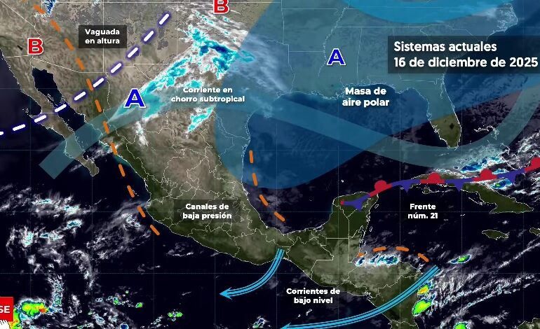 PACHUCA DE SOTO, 16 DIC/NEWS HIDALGO/.- Este día, el frente núm. 21 se extenderá con características de estacionario sobre el golfo de México y noreste del país, manteniendo la probabilidad de chubascos y lluvias fuertes en Tamaulipas. Asimismo, continuará el ambiente frío a muy frío durante la mañana y noche en el norte, noreste y centro de México, con heladas al amanecer en zonas altas; así como viento de componente norte con rachas de 60 a 80 km/h en el istmo y golfo de Tehuantepec. Al final del día dicho frente y la masa de aire polar asociada, dejarán de afectar al país, favoreciendo un gradual ascenso de las temperaturas diurnas. Por otra parte, un canal de baja presión en el oriente y sureste del territorio nacional, la corriente en chorro subtropical, una vaguada en altura y el ingreso de humedad del océano Pacífico, golfo de México y mar Caribe generarán lluvias y chubascos en las regiones del norte, noreste, occidente, oriente, centro, sur y sureste del país, incluida la península de Yucatán.