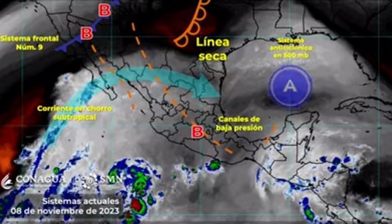 Canales de baja presión extendidos en diversas regiones de México, en combinación con la entrada de humedad del Océano Pacífico, Golfo de México y Mar Caribe; el frente frío número 9, que se aproximará a la frontera norte del país y se prolongará desde el noroeste de Sonora hasta el sur de Baja California; una línea seca que se establecerá sobre el norte de Coahuila, y las corrientes en chorro polar y subtropical, serán los sistemas meteorológicos que generen los efectos mencionados.