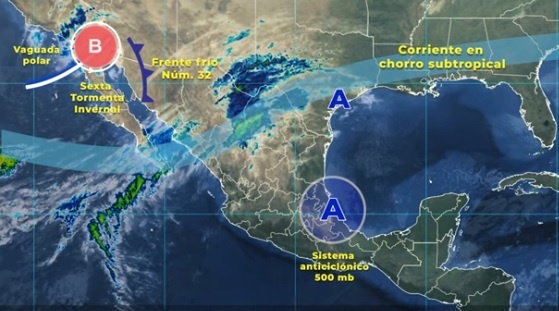 Las condiciones atmosféricas serán ocasionadas por el Frente Frío Número 32 y la Sexta Tormenta Invernal, la cual se moverá hacia el norte del territorio nacional, se internará en Estados Unidos de América y dejará de afectar al país al final del día, ambos sistemas se desplazarán sobre el noroeste y norte del país, así como por el ingreso de humedad del Océano Pacífico, Golfo de México y Mar Caribe.