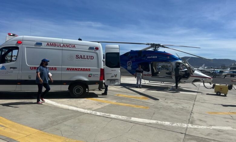 El helicóptero arribó al helipuerto de la ciudad de Pachuca en el estadio Corona del Rosal para el envío y referencia de los niños a especialidades de Pediatría, Traumatología y Cirugía plástica.