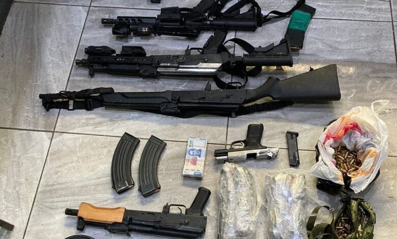 Al desahogar dicha diligencia, los elementos de la PFM, con el apoyo de peritos y elementos de la Secretaría de la Defensa Nacional (SEDENA), localizaron en un inmueble cinco armas largas; cinco armas cortas; mil 324 cartuchos de diferentes calibres; 14 cargadores de diferentes calibres; dos vehículos; dos cuatrimotos; 50 mil pesos en moneda nacional, y detuvieron a José «H», Cristian «B», José «V», Jesús «R», Kevin «V», Heriberto «G», Ana «H», Isis «L», Ariana «A», Rafael «C», Carmen «E», Cayetano «R» y al menor.